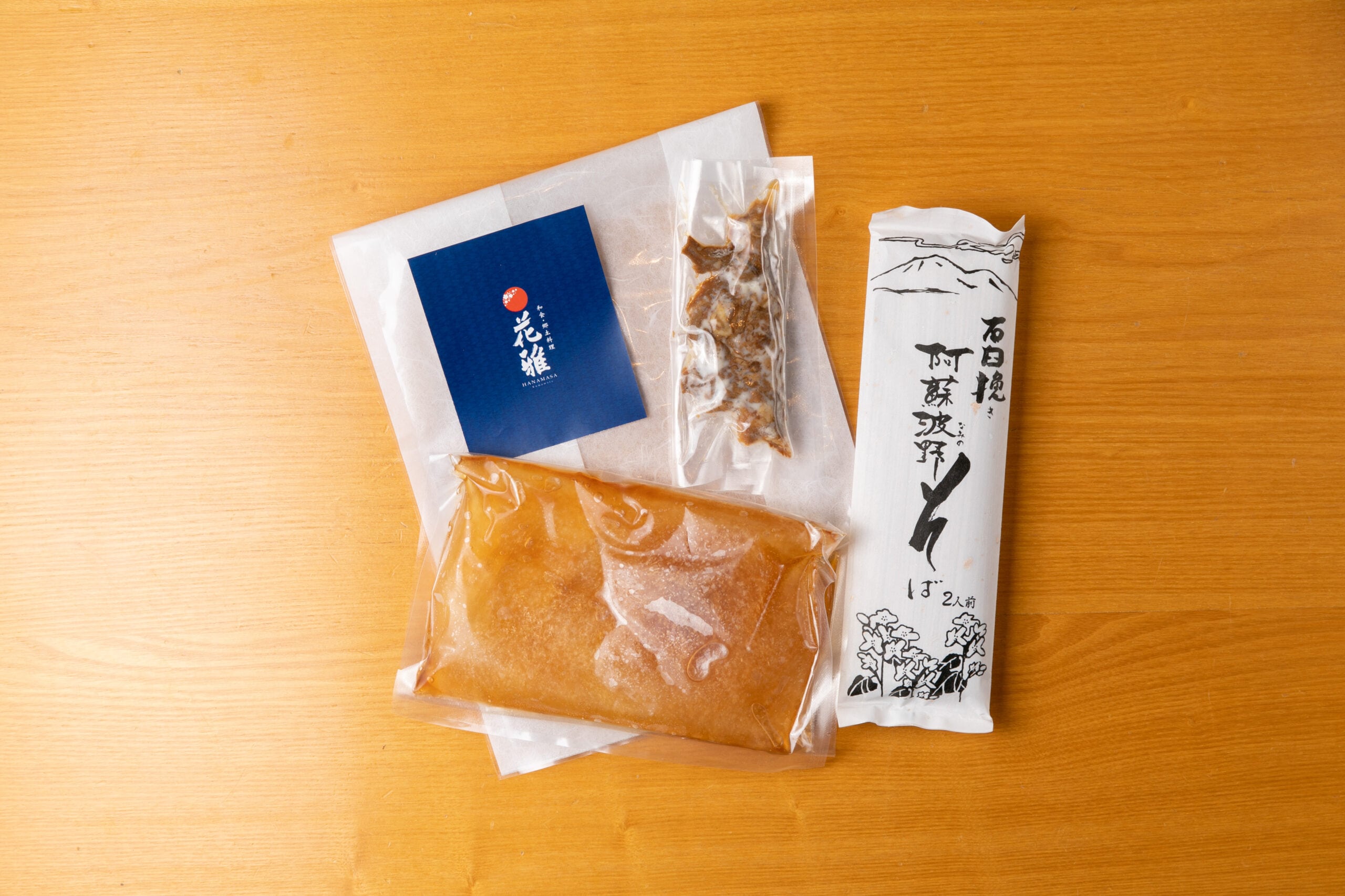 このセットには、本格的な大阿蘇馬肉そばをお楽しみいただくために必要なすべての食材が揃っています。厳選された風味豊かなそば200g、馬肉50g、そして香り高いそば出汁360gが含まれています。